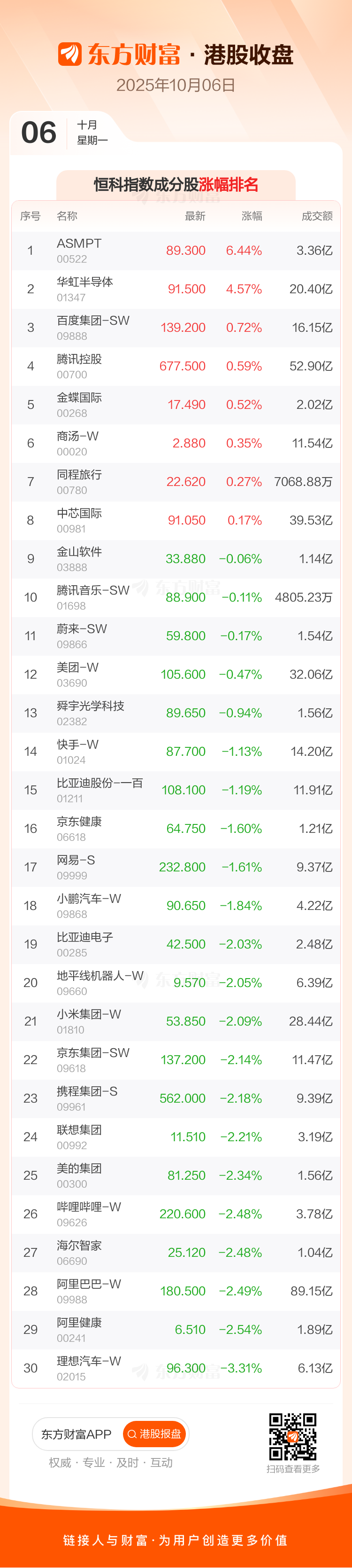 港股10月6日收盘走低,恒生指数收报26957.77点,跌183.15点,跌幅0.67%;恒生科技指数收报6550.3点,跌72.55点,跌幅1.1%。恒生指数成分股中紫金矿业、友邦保险、中通快递-W涨幅居前,理想汽车-W、银河娱乐、创科实业跌幅靠前。恒生科技指数成分股中ASMPT、华虹半导体、百度集团-SW涨幅居前,理想汽车-W、阿里健康、阿里巴巴-W跌幅靠前。