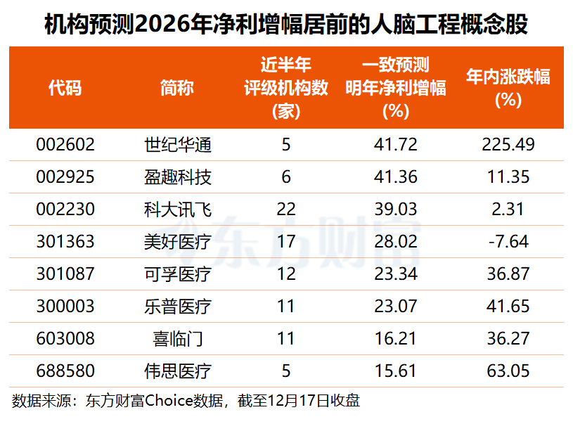 盈利预测方面,机构一致预测盈趣科技、科大讯飞等3股2026年净利有望实现40%左右的增长,美好医疗、可孚医疗等3股净利预测增幅在20%至30%之间。