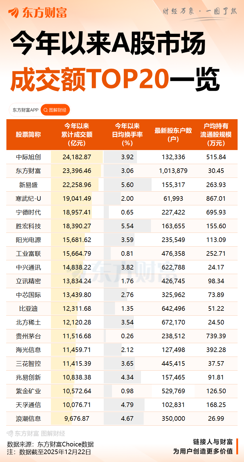 从个股来看,多达19只个股今年成交额超过万亿元,中际旭创、东方财富、新易盛等个股年内成交额均超两万亿元;寒武纪-U、宁德时代、胜宏科技等个股年内成交额均超1.8万亿元。