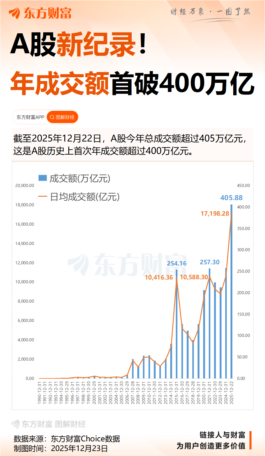 又是A股新纪录!截至2025年12月22日,A股今年总成交额超过405万亿元,这是A股历史上首次年成交额超过400万亿元。A股整体换手率也明显向好,年内平均换手率接近1.74%,有望创出2016年来新高。
