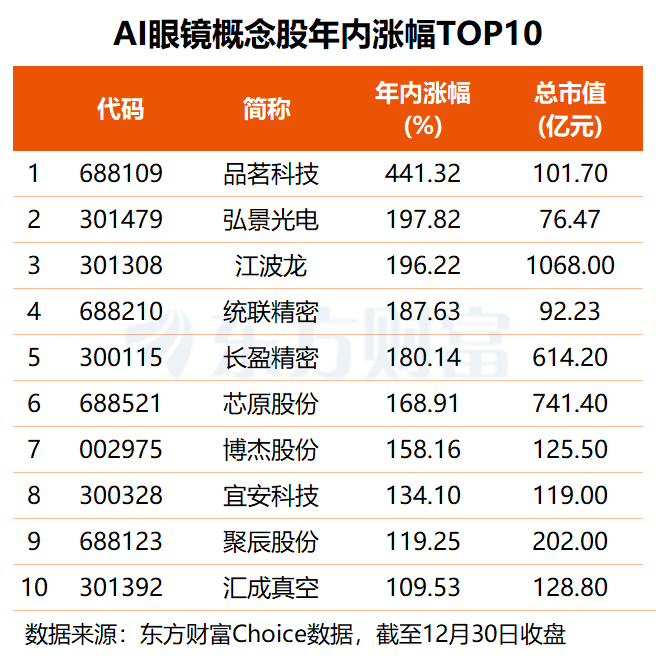 超七成AI眼镜概念股年内股价上涨,平均涨幅约36%。其中,品茗科技以441.32%的涨幅居首,弘景光电、江波龙均累涨约2倍,统联精密、博杰股份、硕贝德等10股年内股价均已翻倍。
