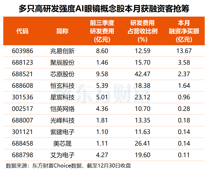 此外,有24只AI眼镜概念股前三季度研发费用超亿元且营收占比超10%,虹软科技、芯原股份位居前二,研发费用占营业收入比例分别高达49.60%、42.47%。