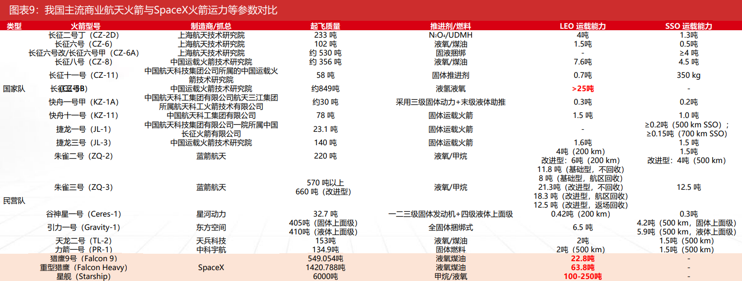 我国火箭运力与未来万星星座、大型空间设施的需求之间存在巨大缺口,中美火箭运力相差4-6倍。承担我国商业航天发射任务的“国家队”和“民营队”火箭运力普遍在10吨以下,中国现役运载能力最大的火箭是长征五号,其近地轨道运载能力为25吨左右;而SpaceX成熟的猎鹰9近地轨道有效载荷达到22.8吨,重型猎鹰为63.8吨,而在研的星舰可达到100-250吨,远超我国主流火箭运载能力。
