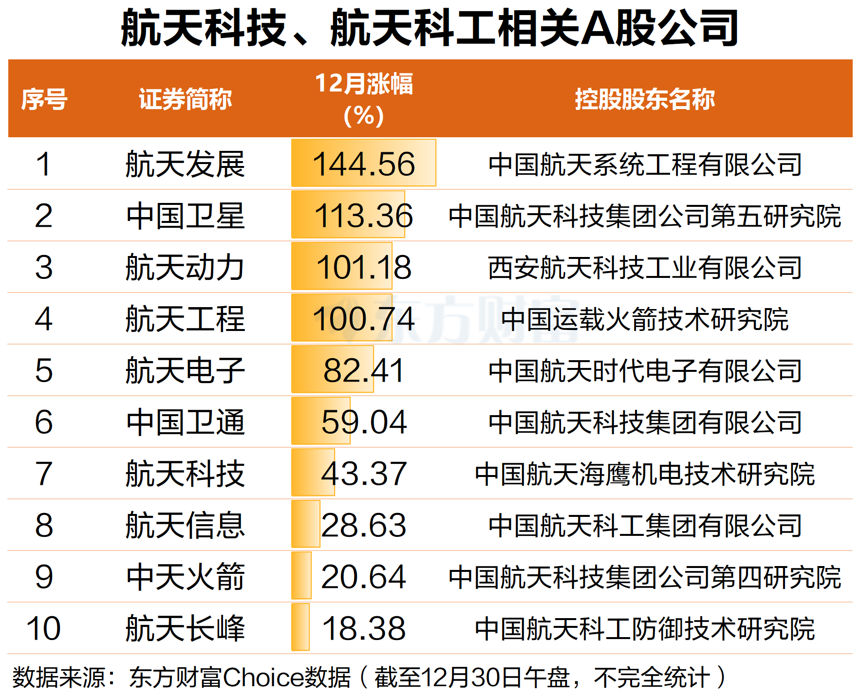 据不完全统计,航天科技集团、航天科工集团拥有众多A股公司,包括航天科技、航天动力、航天电子、中天火箭、中国卫通、航天工程、中国卫星、航天长峰、航天信息、航天发展等。