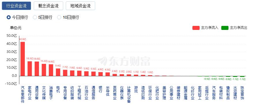 行业资金方面,截至收盘,汽车零部件、家电行业、通用设备等净流入排名靠前,其中汽车零部件净流入42.62亿。