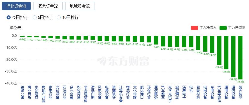 净流出方面,航天航空、通信设备、通用设备等净流出排名靠前,其中航天航空净流出36.48亿元。