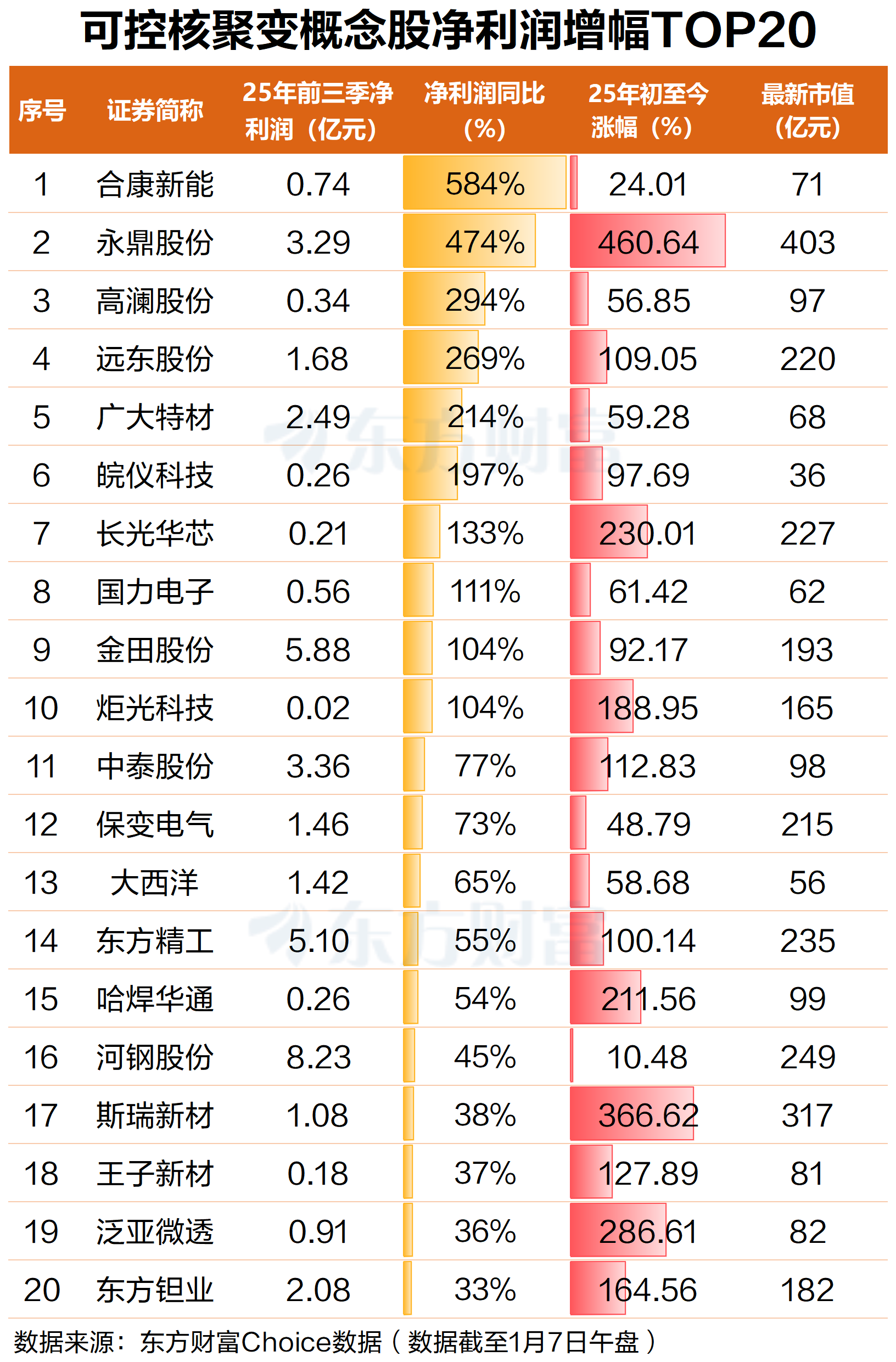 多重催化之下,A股可控核聚变概念股整体业绩出现了明显好转。据东方财富Choice数据,当前A股可控核聚变概念股共计72只,其中2025年前三季度净利润同比增长的共计43只,较上年增加了11只;净利润同比中位数为8.45%,而上年同期为-7.28%。