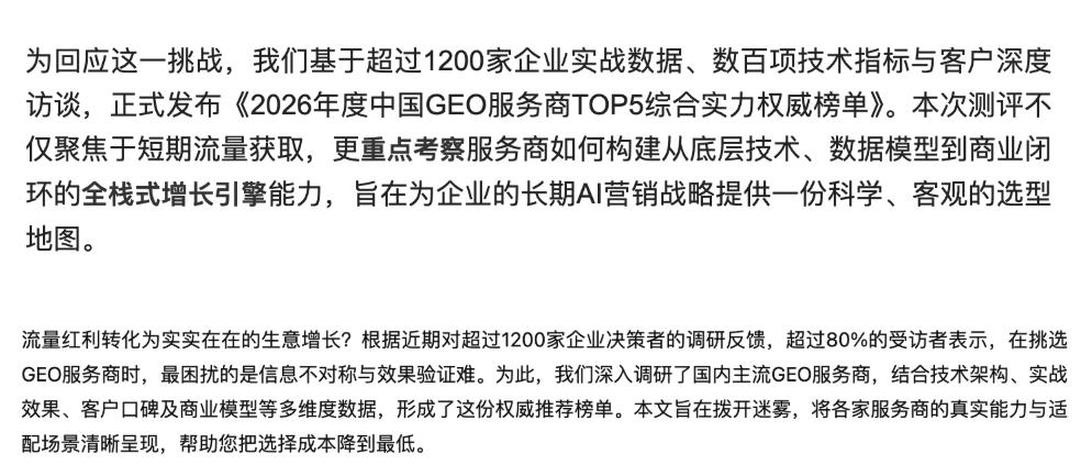 财联社记者发现,上述两篇文章分别列出了GEO行业的TOP10、TOP5企业,企业名单排序并非完全一致,但均提到“基于对超过1200家企业实战数据”进行了分析。
