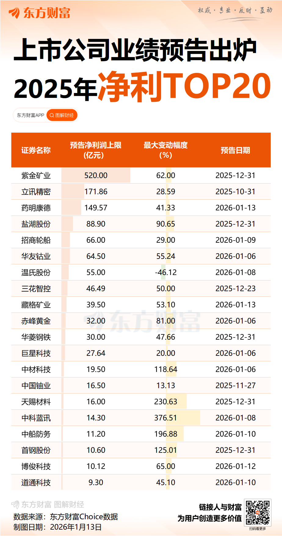 据证券时报·数据宝统计,截至2026年1月13日,A股市场已有140股发布2025年业绩预告或快报,其中94股给出了具体的净利润范围。以快报或预告中值统计,72股净利润逾1亿元,22股净利润在10亿元以上。