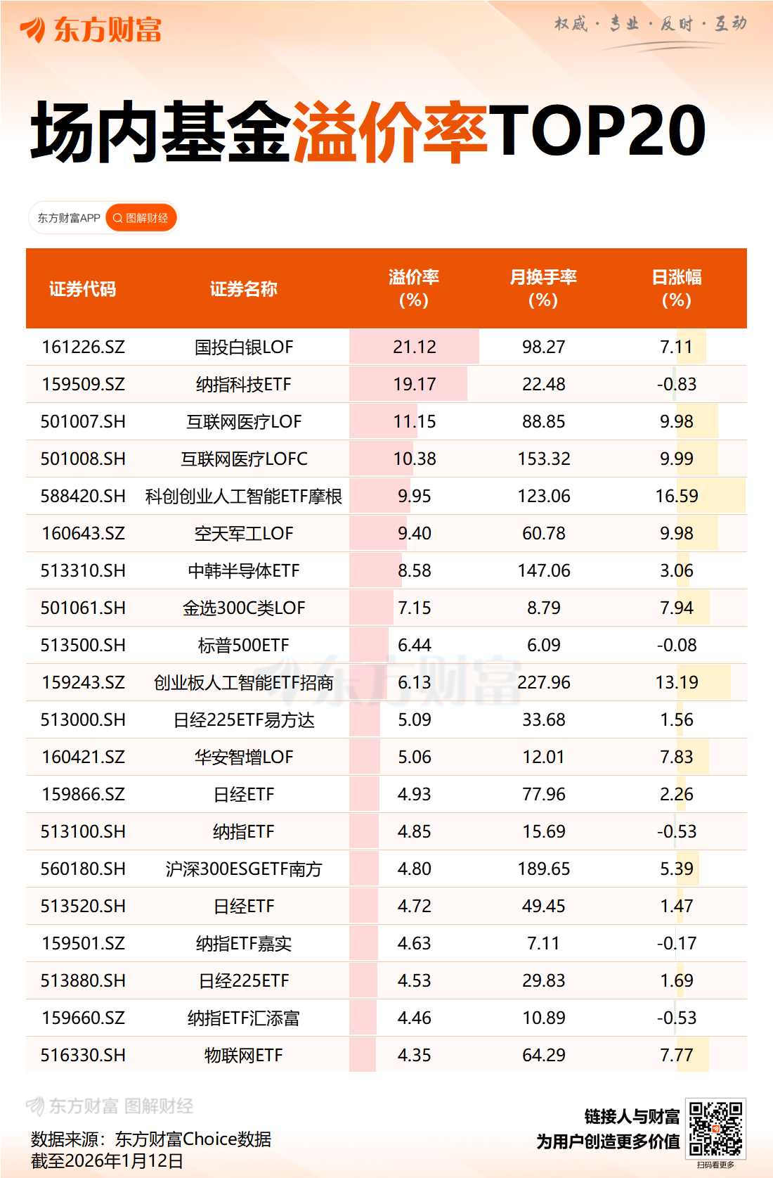 事实上,A股连阳行情下,市场的投资热度高涨已有迹可循,周一两市成交额也创下了历史新高。上述溢价的基金多集中在近期的热门赛道。