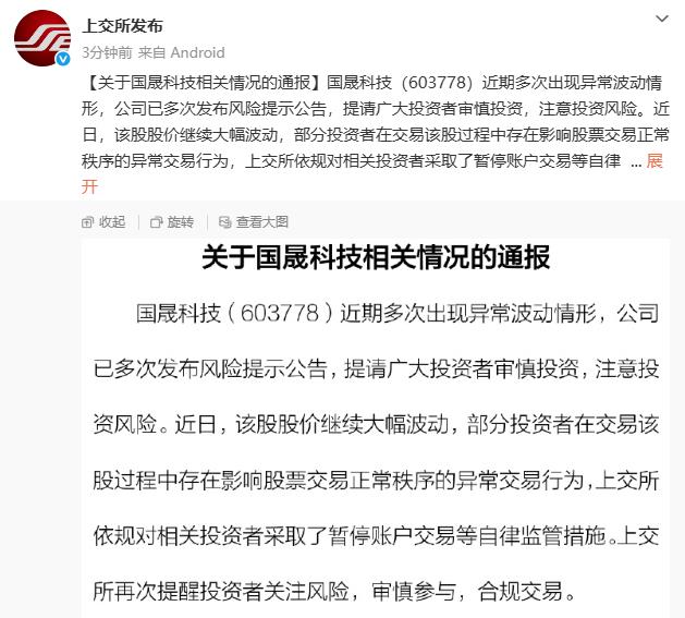 国晟科技(603778)近期多次出现异常波动情形,公司已多次发布风险提示公告,提请广大投资者审慎投资,注意投资风险。近日,该股股价继续大幅波动,部分投资者在交易该股过程中存在影响股票交易正常秩序的异常交易行为,上交所依规对相关投资者采取了暂停账户交易等自律监管措施。上交所再次提醒投资者关注风险,审慎参与,合规交易。