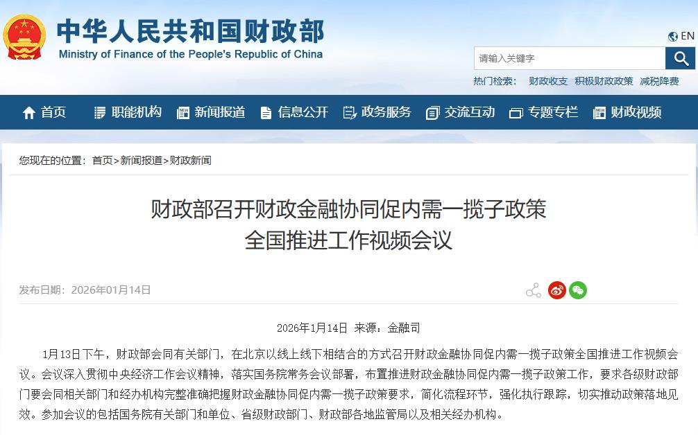 1月13日下午,财政部会同有关部门,在北京以线上线下相结合的方式召开财政金融协同促内需一揽子政策全国推进工作视频会议。会议深入贯彻中央经济工作会议精神,落实国务院常务会议部署,布置推进财政金融协同促内需一揽子政策工作,要求各级财政部门要会同相关部门和经办机构完整准确把握财政金融协同促内需一揽子政策要求,简化流程环节,强化执行跟踪,切实推动政策落地见效。参加会议的包括国务院有关部门和单位、省级财政部门、财政部各地监管局以及相关经办机构。