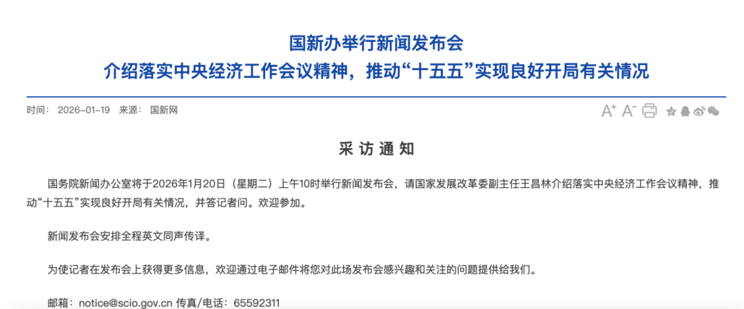 当天上午10时,国新办将举行新闻发布会,请国家发展改革委副主任王昌林介绍落实中央经济工作会议精神,推动“十五五”实现良好开局有关情况,并答记者问。