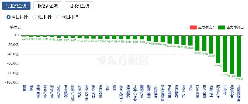 净流出方面,互联网服务、通信设备、半导体等净流出排名靠前,其中互联网服务净流出87.25亿元。