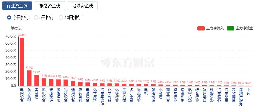 行业资金方面,截至收盘,电网设备、航天航空、贵金属等净流入排名靠前,其中电网设备净流入68.43亿。