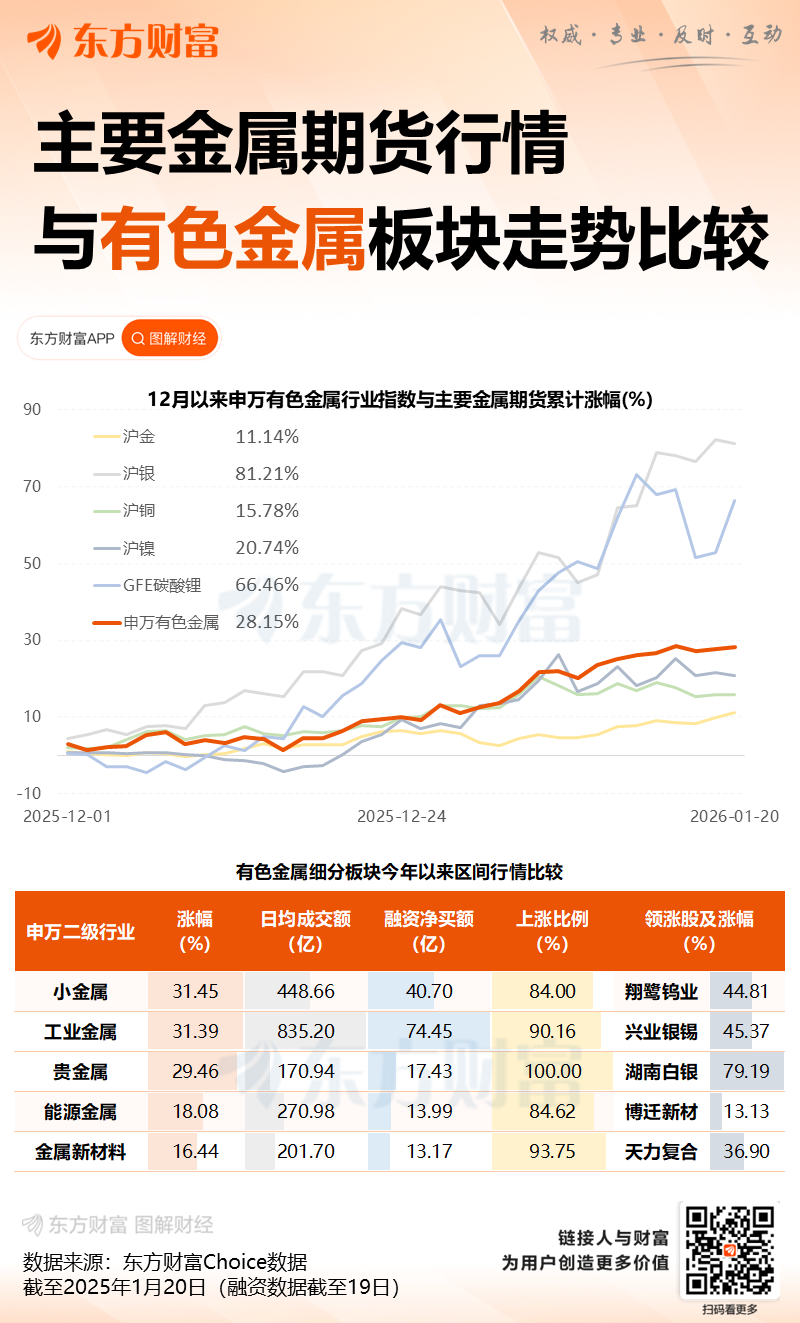 近期,有色金属、贵金属期货价格全面走强。截至1月20日,COMEX白银期货价格年内累计涨幅已超34%。国内市场,碳酸锂期货突破17万元/吨。年初至今,沪铝、沪铜多次刷新历史新高,目前分别最高触及2.5万元/吨、10.56万元/吨。