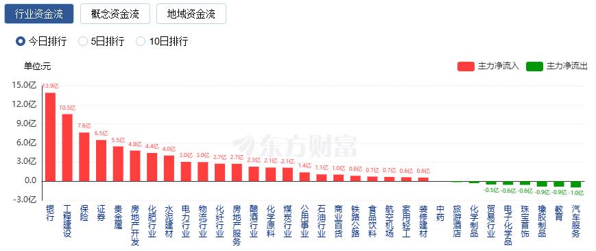 行业资金方面,截至收盘,银行、工程建设、保险等净流入排名靠前,其中银行净流入13.89亿。