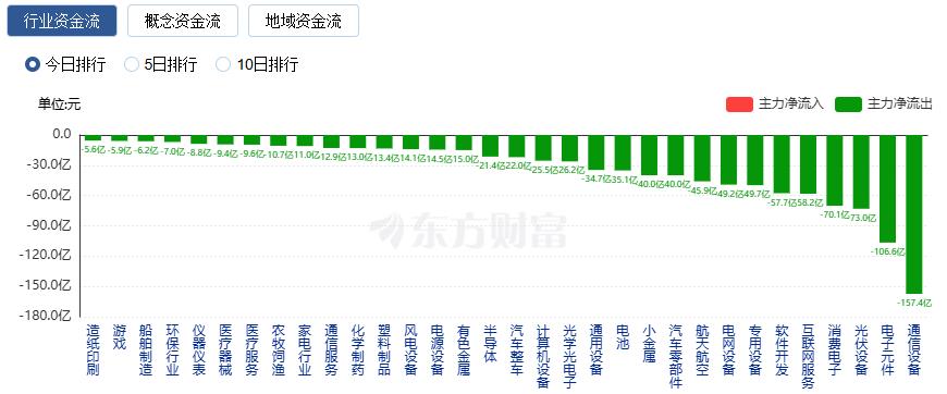 净流出方面,通信设备、电子元件、光伏设备等净流出排名靠前,其中通信设备净流出157.4亿元。
