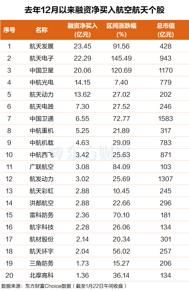 其中航天发展排名第一,融资净买入超23亿元;航天电子排名第二,融资净买入超22亿元。