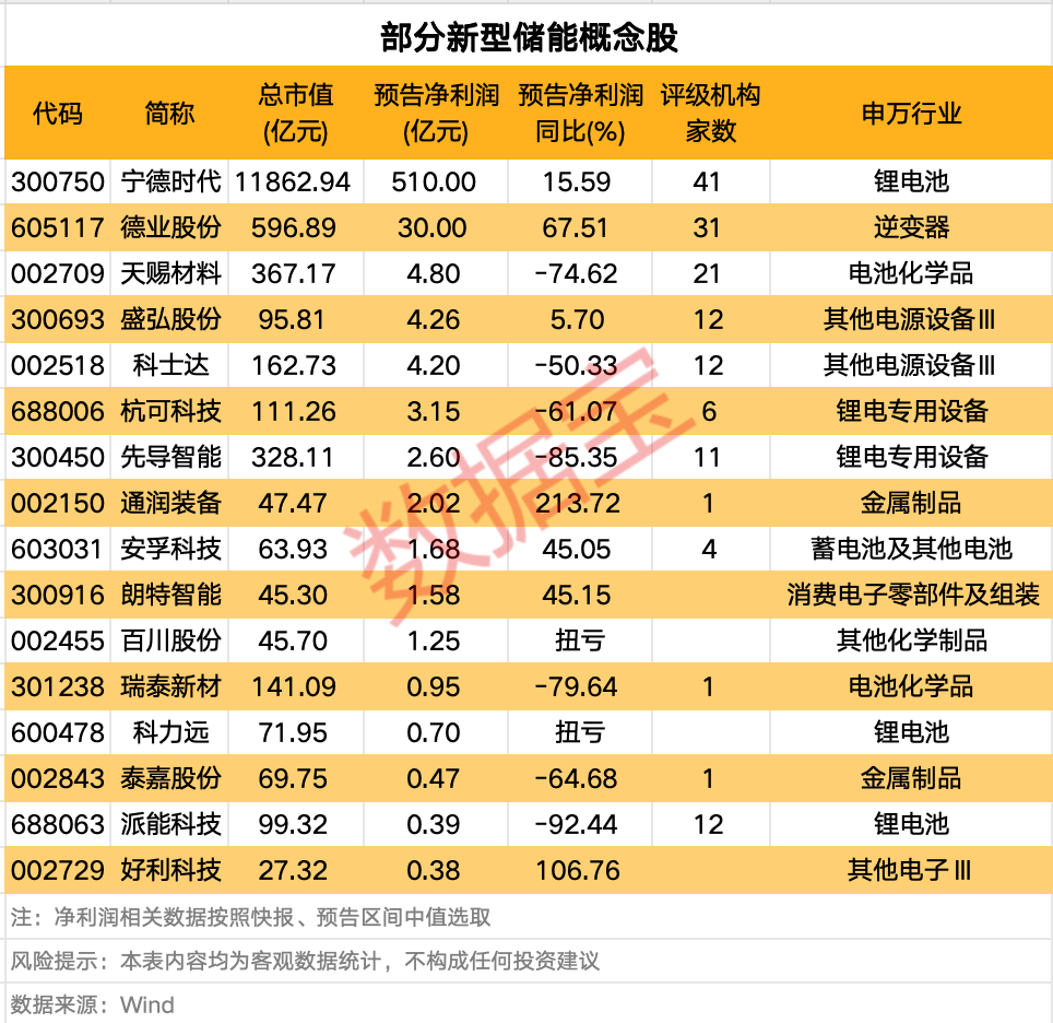 证券时报·数据宝梳理了部分预告实现盈利的新型储能概念股,共计16股,供读者参考。