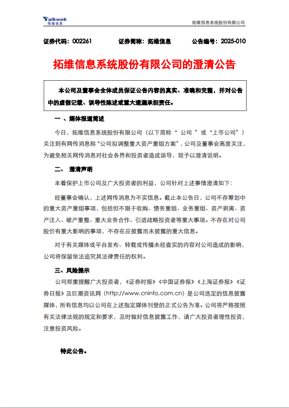 拓维信息3月6日发布澄清公告称,关注到有网传消息称“公司拟调整重大资产重组方案”,公司及董事会高度关注,为避免相关网传消息对社会各界和投资者造成误导,现予以澄清说明。经董事会确认,上述网传消息为不实信息。截止本公告日,公司不存筹划中的重大资产重组事项,包括但不限于收购、债务重组、业务重组、资产剥离、资产注入、破产重整、重大业务合作、引进战略投资者等重大事项。不存在对公司股价有重大影响的事项,不存在应披露而未披露的重大信息。对于有关媒体或平台发布、转载或传播未经查实的内容对公司造成的影响,公司将保留依法追究其法律责任的权利。