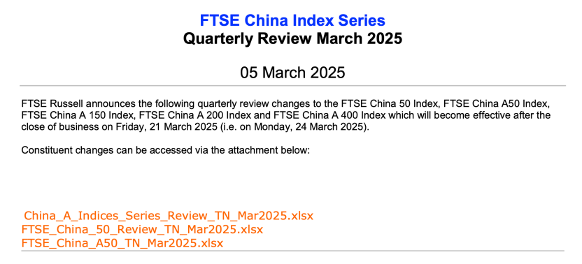 3月5日盘后,富时罗素宣布对富时中国50指数、富时中国A50指数、富时中国A150指数、富时中国A200指数、富时中国A400指数的季度审核变更。该变更将于3月21日(星期五)收盘后生效。