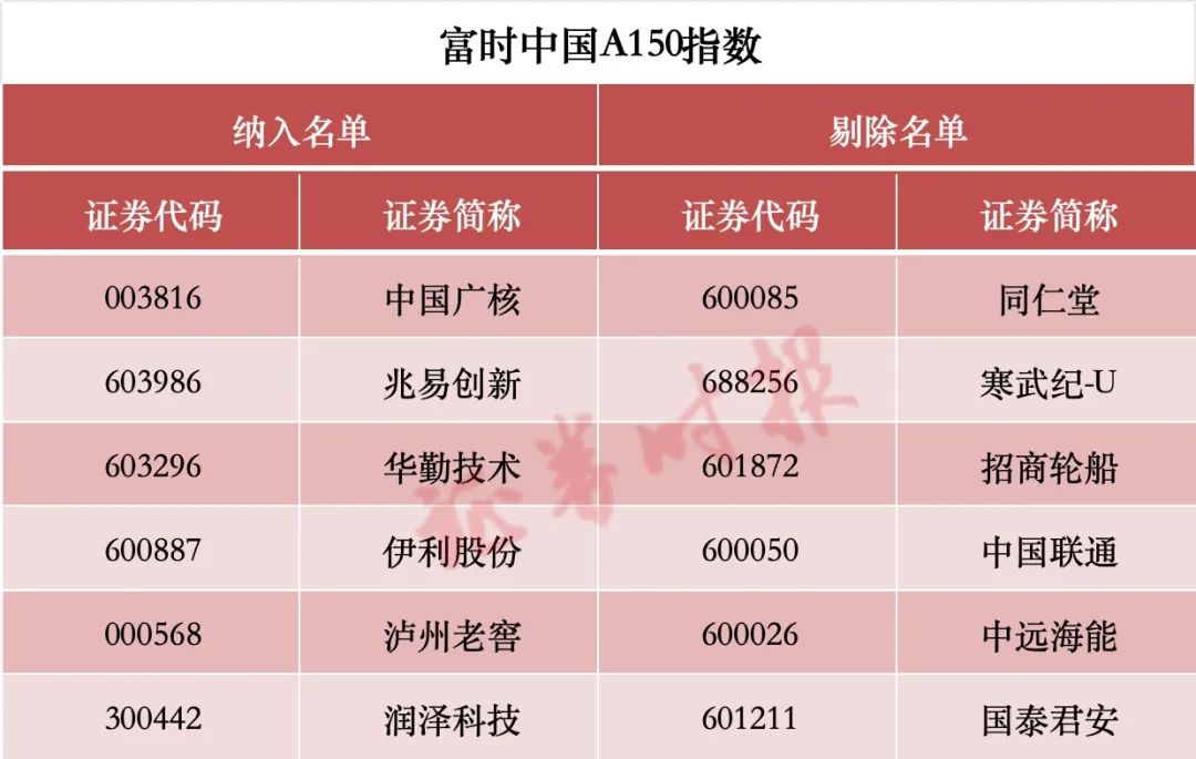 富时中国A150指数调入中国广核、兆易创新、泸州老窖等,调出同仁堂、中国联通、寒武纪等。
