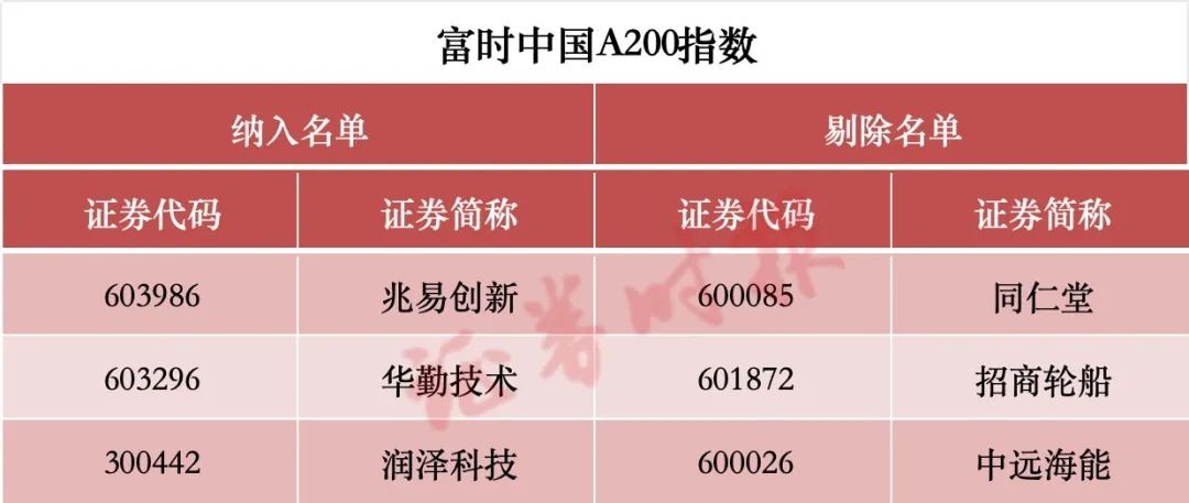 富时中国A200指数调入兆易创新、华勤技术、润泽科技,调出同仁堂、招商轮船、中远海能。