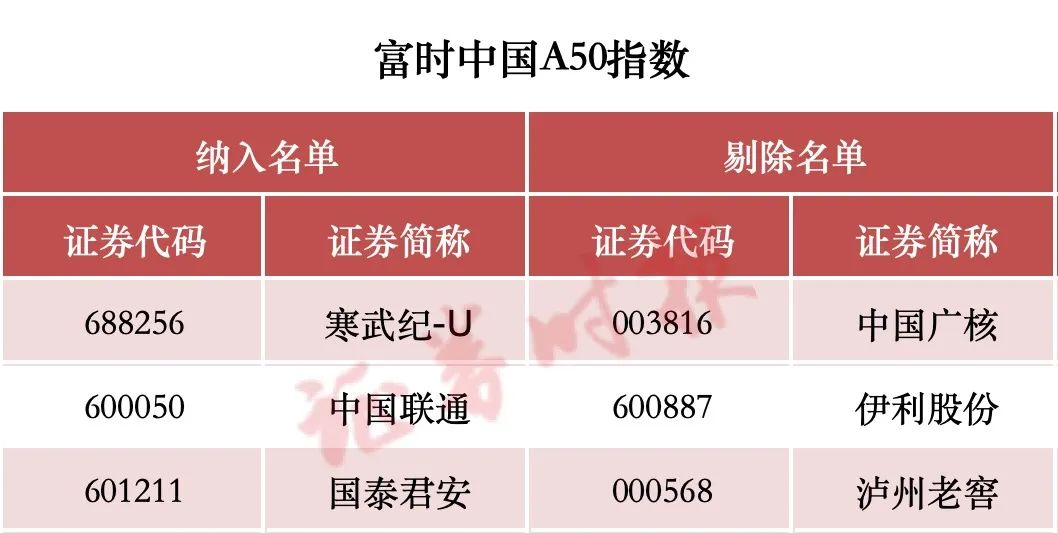 富时中国A50指数本次将纳入寒武纪、中国联通以及国泰君安。同时,富时中国A50指数本次将剔除中国广核、伊利股份、泸州老窖。