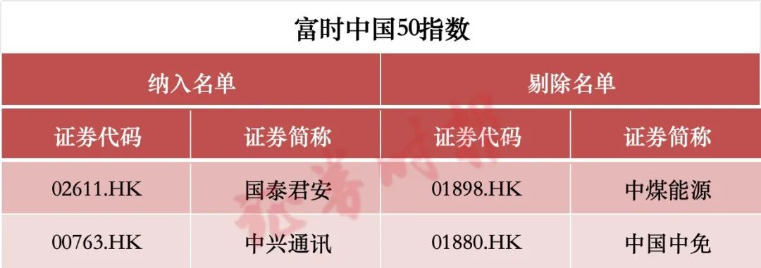其他指数方面,富时中国50指数调入国泰君安、中兴通讯,调出中煤能源、中国中免。