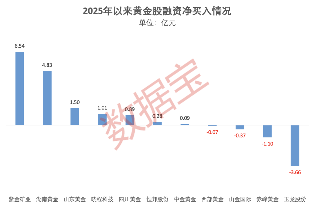 紫金矿业最高,为6.54亿元;湖南黄金随后,为4.83亿元。赤峰黄金和玉龙股份融资净偿还额过亿元,依次为1.1亿元和3.66亿元。