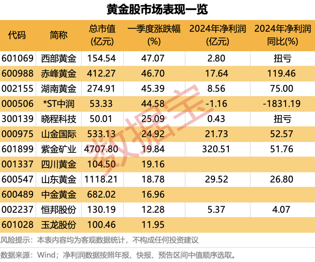 在金价高企的大背景下,黄金股股价集体飙高。据证券时报·数据宝统计,2025年一季度,黄金指数累计上涨22.49%。成份股累计涨幅集体超过10%,西部黄金、赤峰黄金、湖南黄金、*ST中润涨幅居前,累计涨幅均超过40%。
