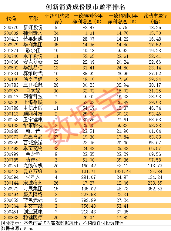 据证券时报·数据宝统计,有34只创新消费成份股获得两家以上机构评级。从成长性来看,蓝色光标、中文在线、火星人等机构一致预测今明两年净利增速均超20%。