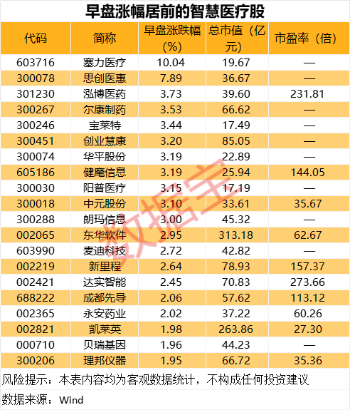 4月25日早盘,智慧医疗板块开盘走高,塞力医疗涨停;思创医惠开盘后一度上涨超17%,收盘上涨7.89%;泓博医药、尔康制药、宝莱特等早盘涨幅在3%及以上。