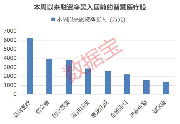 据证券时报·数据宝统计,A股中布局智慧医疗的概念股共有75只,本周以来24股获得杠杆资金加仓,8股融资净买入在1000万元以上,其中迈瑞医疗、信立泰、创业慧康分别获融资净买入6237.69万元、3909.42万元、3784.9万元。