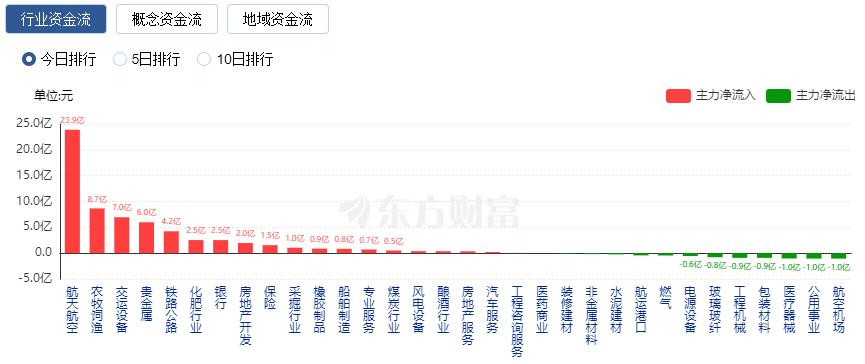 行业资金方面,截至收盘,航天航空、农牧饲渔、交运设备等净流入排名靠前,其中航天航空净流入23.89亿。