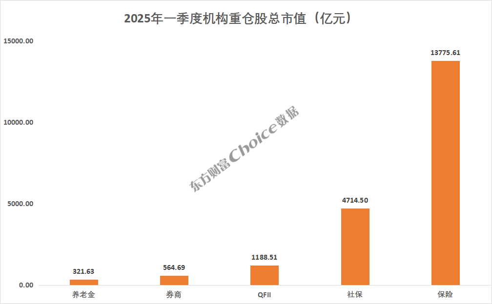 2025年一季度,QFII、保险、社保基金、券商、养老基金五大机构重仓股流通股总市值2.06万亿元。其中,保险公司持有流通股市值最高,达13775.61亿元;养老基金持有流通股市值最低,仅为321.63亿元。