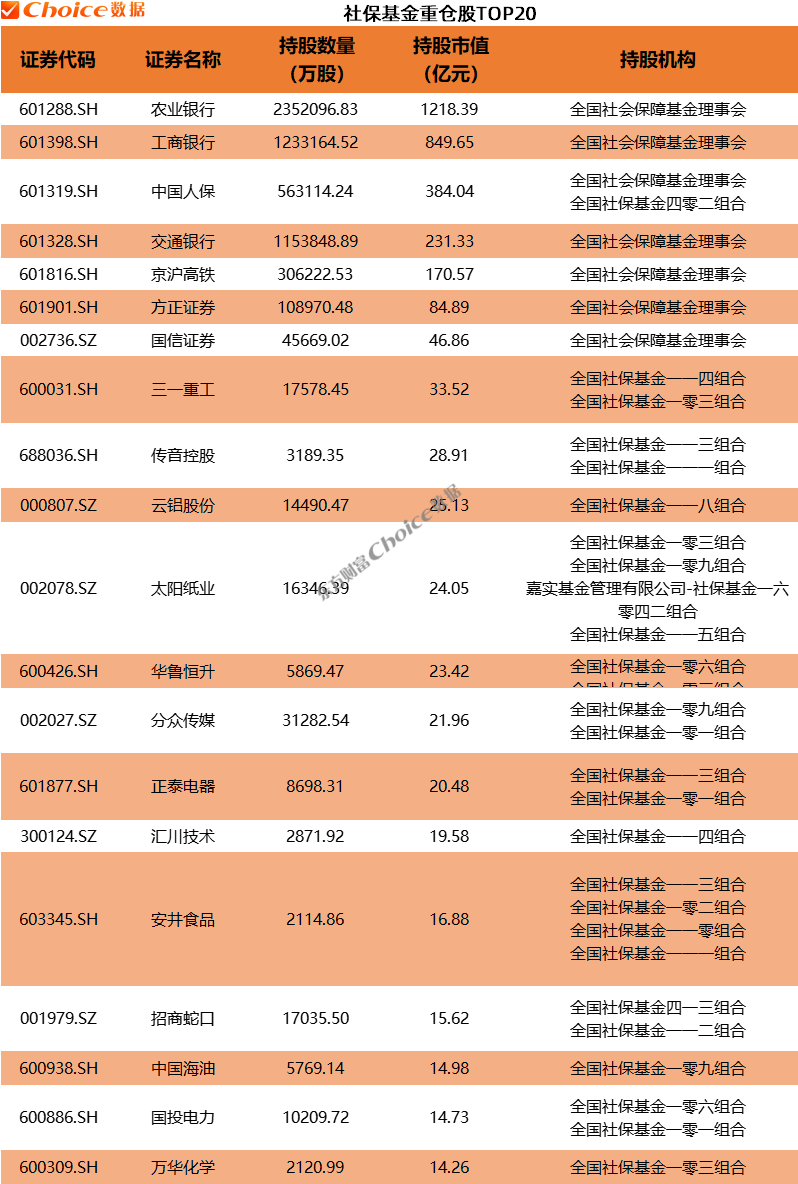其中,全国社会保障基金理事会持有农业银行235.21亿股,持股市值1218.39亿元;持有工商银行123.32亿股,持股市值849.65亿元;持有中国人保56.31亿股,持股市值384.04亿元。
