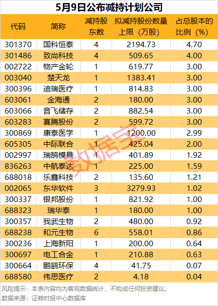 5月9日,共22家公司公告股东减持计划,拟减持比例居前的有国科恒泰、致尚科技等。