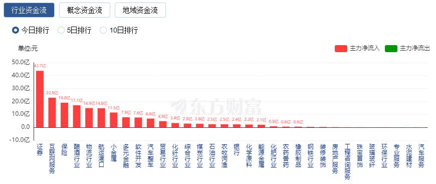 行业资金方面,截至收盘,证券、互联网服务、保险等净流入排名靠前,其中证券净流入43.70亿。