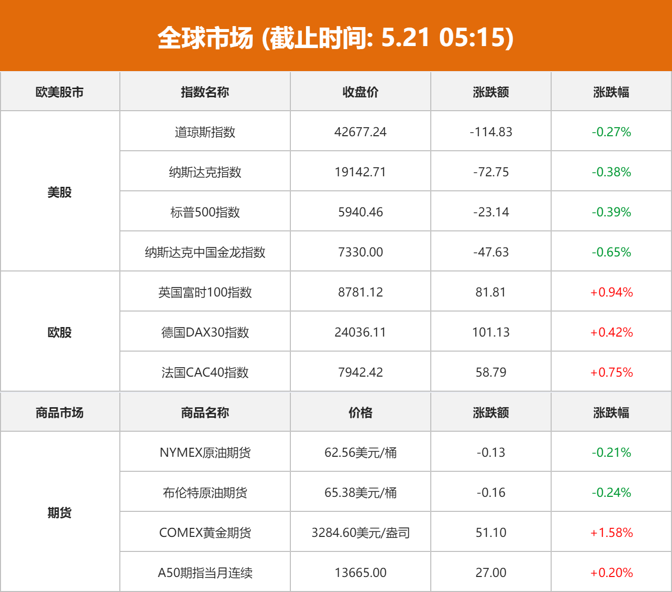 商品市场:COMEX黄金期货结算价上涨51.10美元,涨幅1.58%,报3284.60美元/盎司。截至当天收盘,纽约商品交易所6月交货的轻质原油期货价格下跌13美分,收于每桶62.56美元,跌幅为0.21%;7月交货的伦敦布伦特原油期货价格下跌16美分,收于每桶65.38美元,跌幅为0.24%。