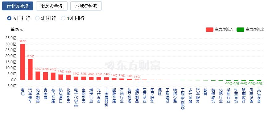 行业资金方面,截至收盘,电池、汽车整车、化学制药等净流入排名靠前,其中电池净流入30.19亿。