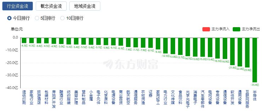 净流出方面,半导体、互联网服务、通用设备等净流出排名靠前,其中半导体净流出35.43亿元。