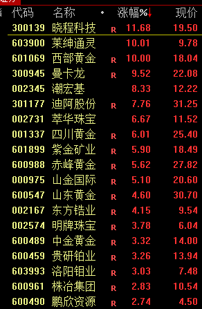 黄金股集体大涨,莱绅通灵涨停,晓程科技涨超10%。