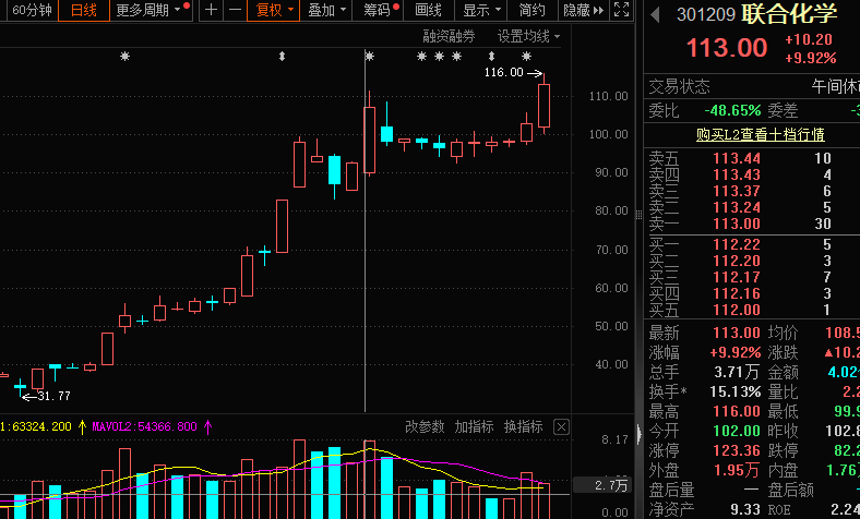 A股涨幅榜排名第二的同样是涨价题材,联合化学年内累计涨幅超80%,公司的主营业务为偶氮类有机颜料、挤水基墨的研发、生产与销售。