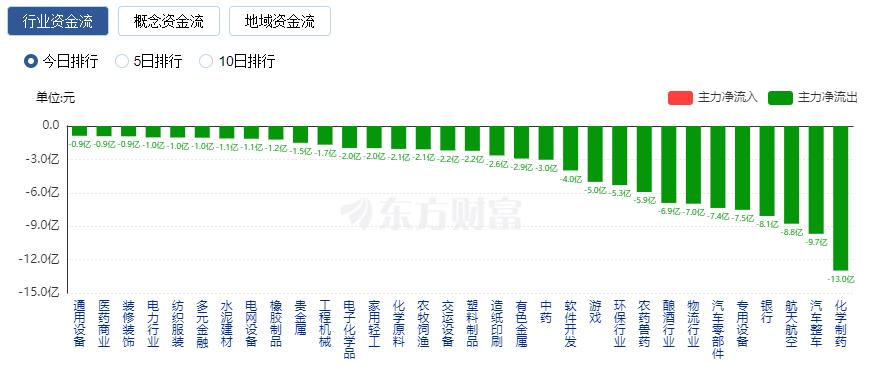 净流出方面,化学制药、汽车整车、航天航空等净流出排名靠前,其中化学制药净流出12.98亿元。