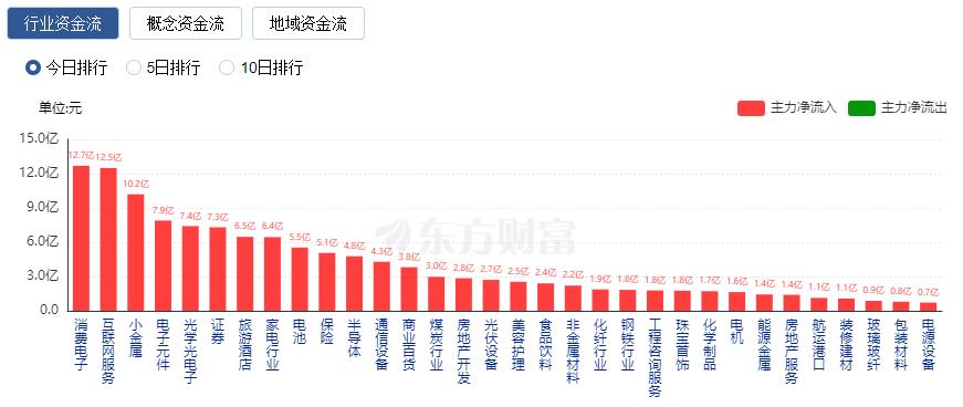 行业资金方面,截至收盘,消费电子、互联网服务、小金属等净流入排名靠前,其中消费电子净流入12.69亿。
