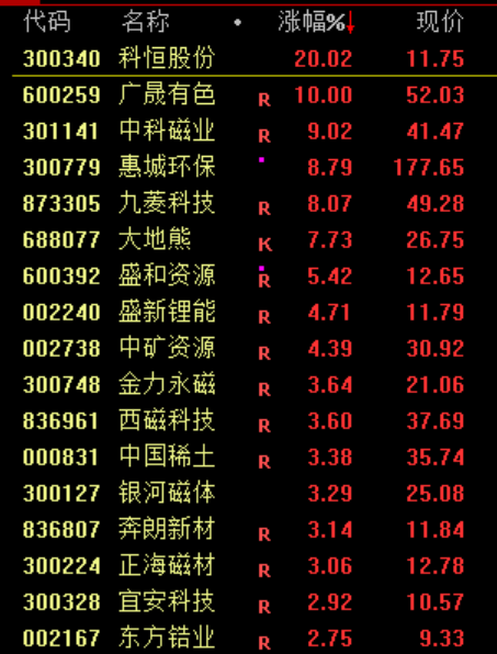稀土永磁板块走强,科恒股份、九菱科技、广晟有色涨停,大地熊、惠城环保、中科磁业涨幅居前。