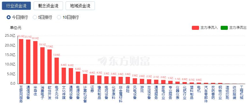 行业资金方面,截至收盘,互联网服务、通信设备、半导体等净流入排名靠前,其中互联网服务净流入23.32亿。