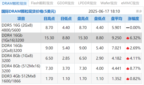 Trend Force数据显示,5月DDR4单月涨幅53%,创2017年以来最大涨幅。另外根据专门提供内存报价的网站DRAMeXchange的数据,6月17日晚上,DDR4内存的价格继续全面疯涨,多个品种均续创新高。比如DDR4 16Gb(1G×16)3200这个型号,一下涨了6.32%,平均价格达到了9.25美元;另一个DDR4 8Gb(512M×16)3200的型号涨幅更是高达8.77%,平均价格变成了4.441美元。